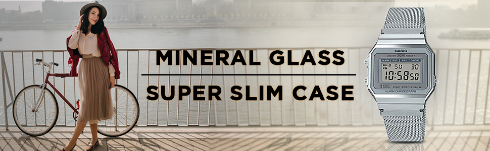 Case / bezel material: Resin Adjustable Clasp Stainless Steel Mesh Band SUPER SLIM CASE Mineral Glass Water Resistant LED backlight 1/100-second stopwatch Measuring capacity: 59’59.99” Measuring modes: Split time, 1st-2nd place times Daily alarm Hourly time signal Auto-calendar (set at 28 days for February) 12/24-hour format Regular time keeping: Hour, minute, second, pm, date, day Accuracy: ±30 seconds per month Approx. battery life: 3 years on CR1616 Size of case : 37.4×35.5×6mm Total weight : 53g.